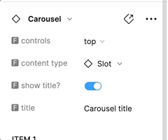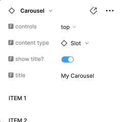 In the design panel, you will see the ⬦Carousel component instance, along with its configurable properties — including 🄵 title.